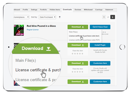 - Click ‘download’ button, and in the drop down menu select “license sertificate & purchase code”